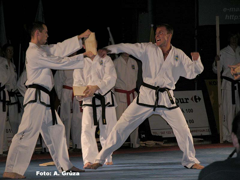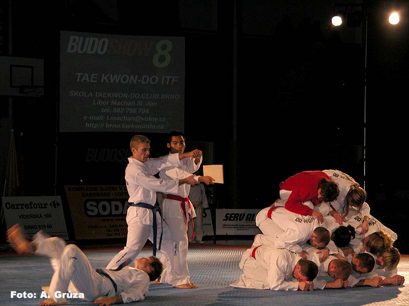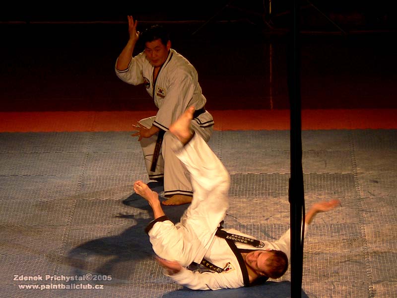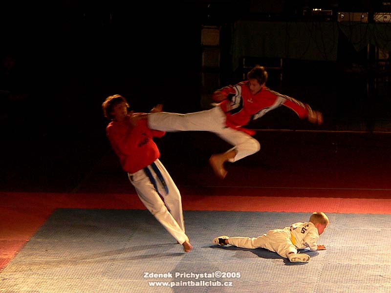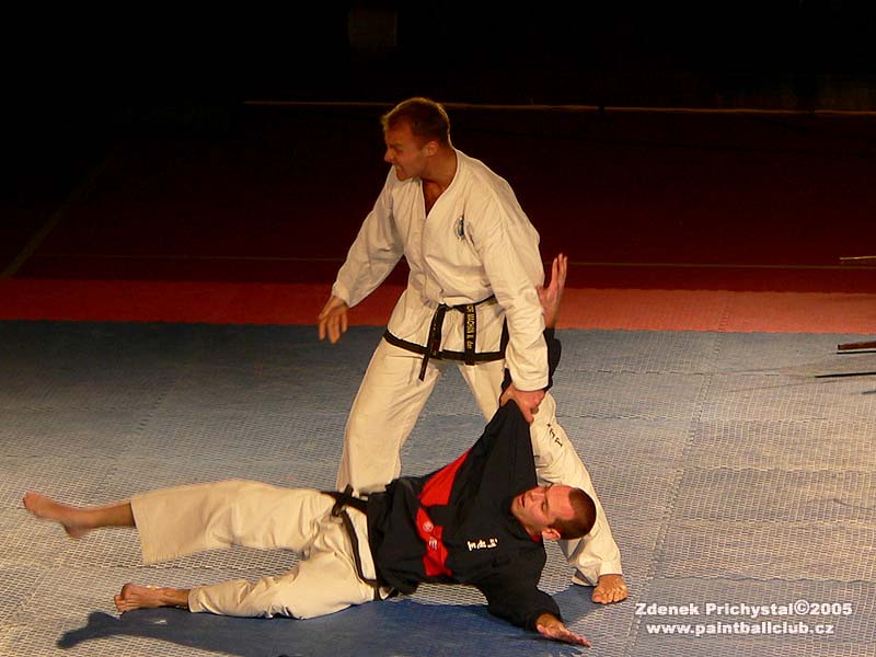 Dosti tedy teorie a povězme si radši o Budoshow. Jak jsem již napsal proběhla v neděli 20.11. v nové hale Na vodové v Králově poli a to jako již osmý ročník, což mimo jiné svědčí i o její úspěšnosti. Celým programem provázel konferenciér Borek Kapitančík z rádia Krokodýl a během tří hodin se zde vystřídala celá škála bojových stylů a škol. K vidění zde byly mimo jiné i Musado, Taekwon-do, Wing-tsun, Capoeira, Kick box, Karate, Tai-chi, Wu-shu, Hapkido a mnoho dalších. Tradičně vynikající byla ukázka Musado, jedná se o tvrdé a velmi účinné techniky vycházející z korejských stylů, musado je určeno pro armádní profesionály a tím je dáno i jeho zaměření, žádný sport ale boj na život a na smrt. Vynikající byla z mého pohledu sestava Tai-chi ke kterému mám navíc osobní vztah, v sestavě se střídala jemnost s tvrdostí, velmi působivé. Co mě opravdu dostalo, bylo předvedení korejského hapkida které jsem viděl poprvé a které ve mě zanechalo velmi hluboký dojem. Velmi tvrdé, efektivní, destruktivní. Stejně tak ladnost a efektivita aikida, gymnastické prvky capoeiry které předváděl brazilský mistr středního věku, přerážecí techniky kdy se lámaly dřevěné tyče o ruce a holeně, hromadné sestavy a vystoupení Pavla "hakim" Majera známého i z K-1, jedním slovem vynikající! A pokud by zde byla i bohužel odřeknutá Krav maga (na tu lákám ke cvičení i Beriho který se stále cuká, ani Tai-chi nechce, k tomu se naopak přidal Kamil "svitávka") bylo by to dokonalé. Celý pořad byl doslova nabytý skvělými ukázkami a pokud bych se zde měl věnovat každému stylu, byl by to článek nejméně na dvě stránky a tolik vás zas otravovat nebudu:) Ale co určitě udělám je, že vás pozvu na společnou návštěvu ročníku dalšího. A nezapomeňte, jedině sebezdokonalováním se dá jít kupředu a např. dechová cvičení qi-gong jsou pro hráče paintballu velkým přínosem, nezaberou denně víc času jak 20 minut a cvičit ho může opravdu každý! Sestřih z 8. ročníku brněnské Budoshow uvidíte v prosinci na Eurosportu v pořadu Fight club, kde se těším i na finále K-1. Play X-ball, play fair. ZP 2005