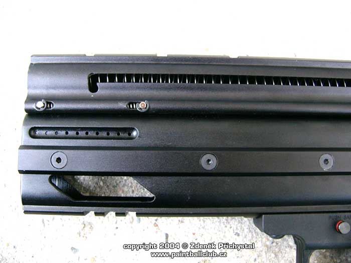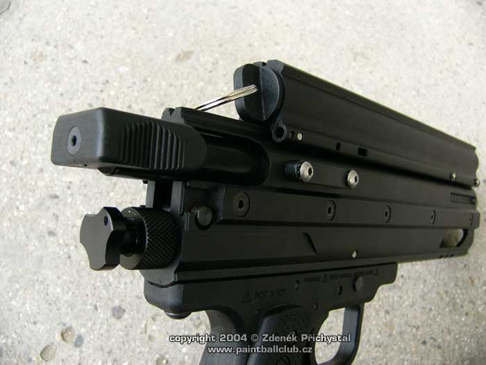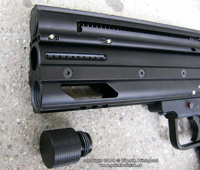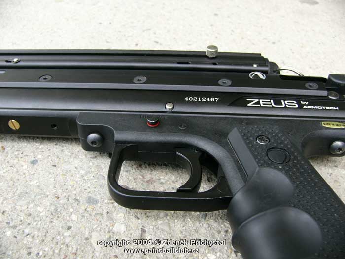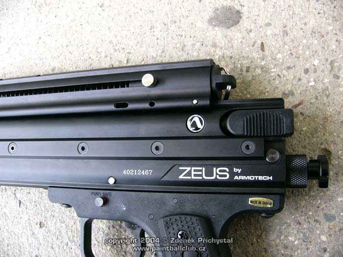 O co tedy jde: Zeus je jak již bylo řečeno plný poloatomat umožňující rychlou a efektivní střelbu, o přísun kuliček se stará tlačná pružina umístněná v horizontálním trubicovém zásobníku který tvoří horní část zbraně. Toto řešení je spolehlivé a kvalitní, při nabíjení zafixujeme pružinu v přední části a kuličky lehce uložíme. Poté pružinu odjistíme a zbraň je připravena ke střelbě. Díky výřezu těla zásobníku máme navíc stálý přehled o zbývajících kuličkách. Jednoduché ale účinné, nemyslíte? Jako medium je použito CO2 ve 12ti gramových bombičkách, všichni jistě znáte. Vystačí pro 20 - 30 výstřelů, záleží na nastavení úsťové rychlosti a počasí, tedy venkovní teplotě a vlhkosti, neboť jak známo největší nepřítelem plynové efektivity u CO2 je chlad a mokro. Úsťová rychlost je u ZEUSe velmi dobře stavitelná a to pomocí šroubu, tedy řešení známé a oblíbené u většiny mechanických semiatomatů. 12 gr bombička se vkládá zepředu pod hlaveň a poté upevní a dorazí na jehlu šroubovací zátkou. Její výměna je tedy jednoduchá a rychlá.