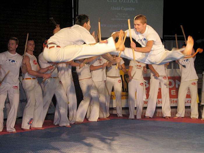 CAPOEIRA – už se pomalu blížíme na konec přehlídky večera bojových umění. Obecně se říká, že to nejlepší je vždy na konec. Přehlídka ABADA Capoiera Brno byla pořadateli dán na konec ze zištných důvodů. Publikum dokáže vyburcovat všechny na tatami k super výkonům. Brněnsky oddíl vede brazilský trenér GRADUADO CHARRADA, je přímý žák professora Paçocy, který vystoupil v Brně minulý rok. Capoeira je brazilské bojové umění, vyvinuté a zdokonalené potomky otroků přivezených z Afriky. Představuje unikátní kombinaci boje, tance a akrobacie, provázenou zpěvem a hrou na hudební nástroje. Její filozofie a rituální forma ji řadí na místo nejrychleji se rozvíjejícího bojového umění na světě.
