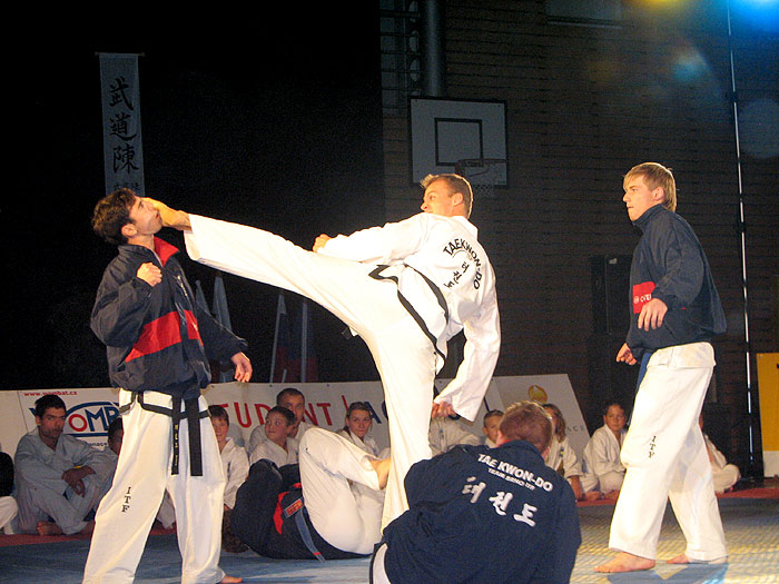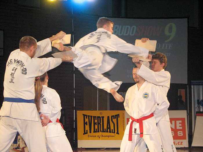 TAEKWONDO I.T.F. – již po deváté v řadě se nám předvedli adepti místního pořadatelského klubu TAEKWONDO CLUB BRNO ITF. Taekwondo je korejské bojové umění sebeobrany, které bylo poprvé představeno světu jeho zakladatelem, generálem CHOI HONG HI v roce 1955. V Brně se začalo Taekwondo cvičit od roku 1990 a od roku 1993 funguje Škola TAEKWONDO CLUB BRNO s více než 250 členy, pod vedením LIBORA MACHÁNĚ , vicemistra Evropy 2005, několikanásobného mistra ČR, absolutního mistra ČR 2005. V ukázce jsme měli možnost vidět spoustu přeráženích technik, sebeobranu, bojů v podání nejlepších reprezentantů brněnské školy. V přerážecích technikách se nám představil i syn Libor Macháň junior (7 let) taekwondu se věnuje již od malička a je to jeho již 7 budoshow. Na první měl ještě dudlík v puse a už bouchal do desek. Určitě to také někam dotáhne minimálně jako jeho otec Macháň st.