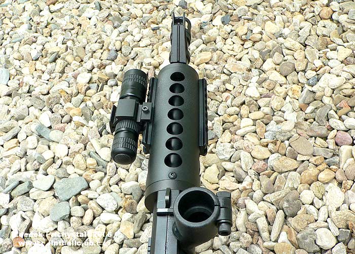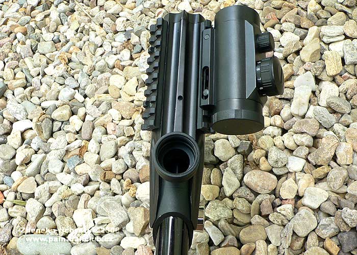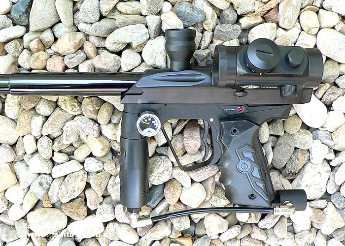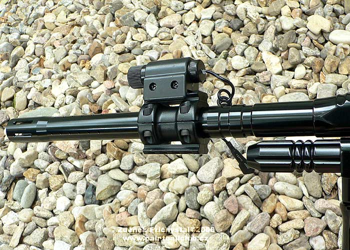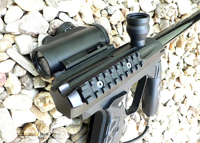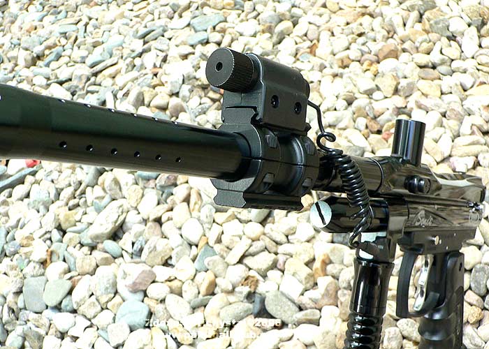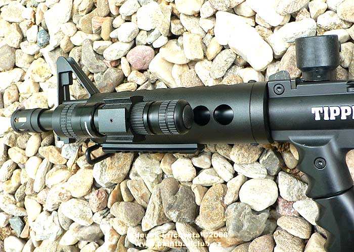 Je jasné, že chceme-li protihráče efektivně vyřadit a nevystřílet při tom krabici kuliček, musíme mít možnost mířené střelby. U nových paintballových značkovačů které jsou designovány spíše pro sportovní použití, je to ovšem problémem. Centrální kolínko zásobníku znemožňuje použití optiky a navíc jen velmi málo značkovačů je vybaveno lištou pro její uchycení, obzvláště Spydery. Pro boj v budovách je ideální (pomineme-li právní stránku věci) laser, jeho výhodou je jeho dosah a intenzita bodu, snadnost míření a možnost střelby v jakékoliv pozici bez nutnosti mít značkovač v rameni. Zde ovšem vyvstává ona otázka: kam s ním? Jedno z řešení vidíte na přiložených fotografiích, jedná se o dvoudílný tubus vybavený dvěma lištami který snadno připevníme k hlavni a osadíme laserem, na druhou kolejničku můžeme připevnit třeba baterku, která v tmavých interiérech jistě také příjde vhod.