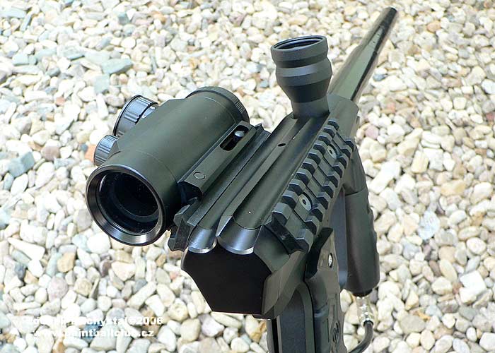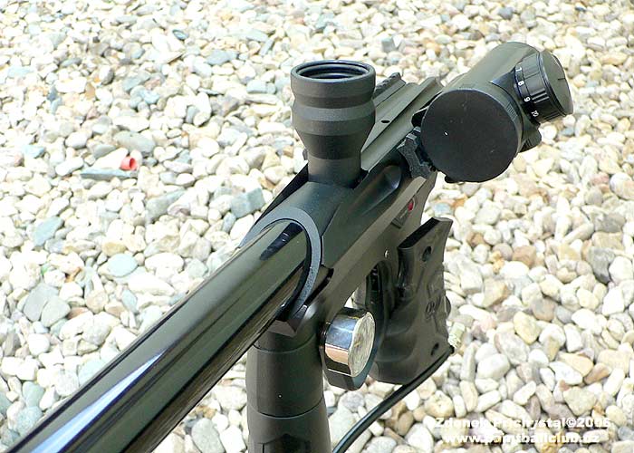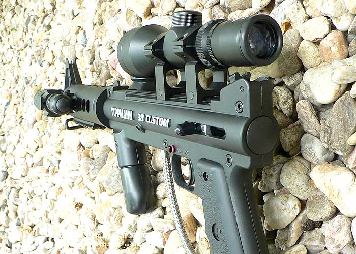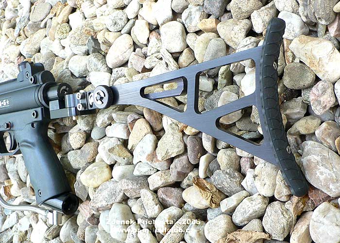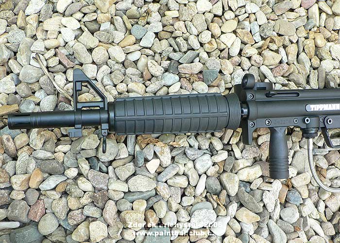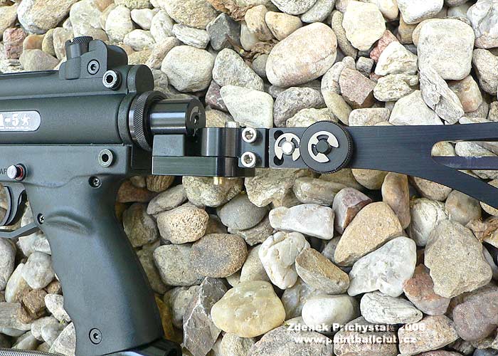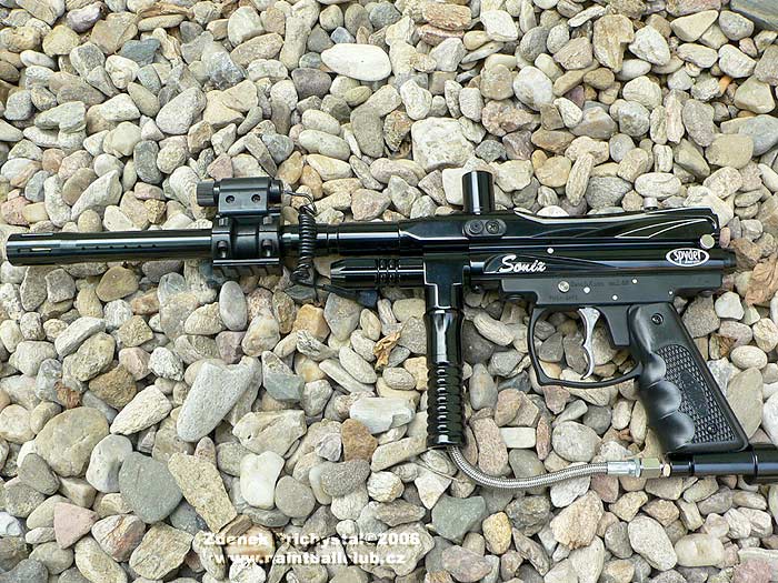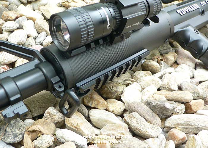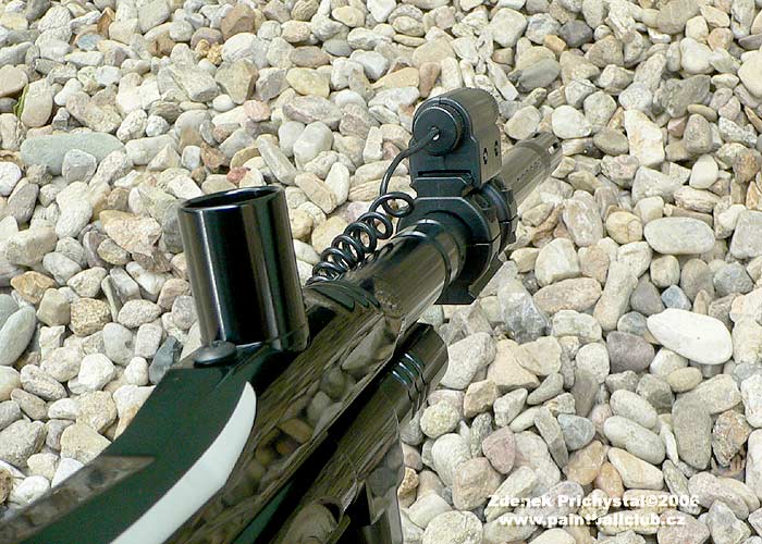 Jedním z nejpopulárnějších značkovačů je pro příznivce woodbalu bezesporu Tippmann a zde je možnost připevnění zaměřovače příznivější nežli u Spyderu. Díky bočnímu kolínku si můžeme dovolit komfort optiky, kterou využijeme (obzvláště máme-li model vybavený zoomem) jak pro mířenou střelbu, tak i pro prohlídku terénu, nežli do něj vstoupíme. Jste-li navíc jako já příznivci velkokapacitních lahví s CO2 umístněných na zádech a se značkovačem spojených hadicí, jistě vám příjde vhod i stavitelná pažba, bez které by přesná střelba na dálku nepřipadala v úvahu. Pažba je délkově stavitelná a sklopná, její montáž je velmi jednoduchá. Přidáme-li navíc ke svému značkovači předpažbí osazené montážními lištami a hlavní ve stylu M-16, získáme tak jak vysokou efektivitu, tak i dokonalý vzhled.