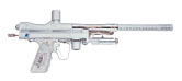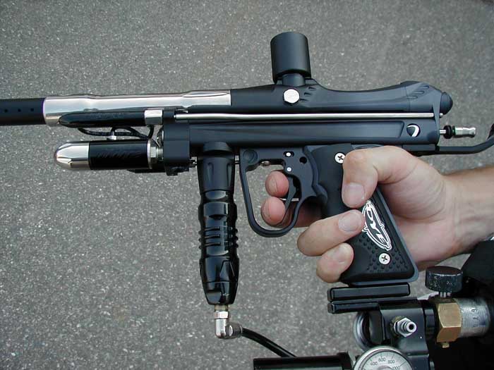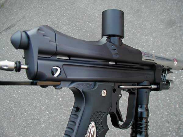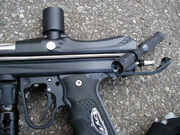 Po otevření nenápadné krabice vás překvapí zvláštní matná povrchová úprava a lehkost zbraně. Celé tělo má moderní design a je odlehčeno spoustou vybrání. Barva těla, v tomto případě je to „black to cobalt“, vypadá na přímém světle a ve stínu jinak. Zbraň je vybavena center feedem, který je možno odšroubovat a třeba nahradit jiným typem. Zadní blok je zapuštěn do těla zbraně, takže už tolik nevyjíždí dozadu. K uchycení závěru do zadního bloku již nepotřebujete pin, protože ventura je opatřena bajonetovým zámkem. Při její montáži je třeba si dávat pozor na správnou polohu, aby nedošlo k otočení a zadrhnutí o blokaci. Nejvíce zvědav jsem byl na spoušť, protože se jedná o mechaniku se zkráceným chodem, díky které se dá dosahovat rychlostí kadence jako u elektro zbraní. Krátký chod má na svědomí nový třícestný regulátor a nastavitelný chod spouště. Délka tahu je cca 1,5 mm což u mechaniky považuji za excelentní! Všechny regulátory jsou vyvinuty přímo firmou DYE a přes mou počáteční skepsi jsou skutečně vynikající. LPR regulátor je pochopitelně stavitelný. Rozdíl mezi jednotlivými výstřely měřený na radaru, činil maximálně 2 FPS. Je škoda, že hlavní DYE in – line regulátor není dodáván už v základu. Naopak velice potěšující je to, že už v základu dostanete ke zbrani hlaveň 12´´ Boomstick, která opravdu prokázala svoje kvality v dostřelu a přesnosti.