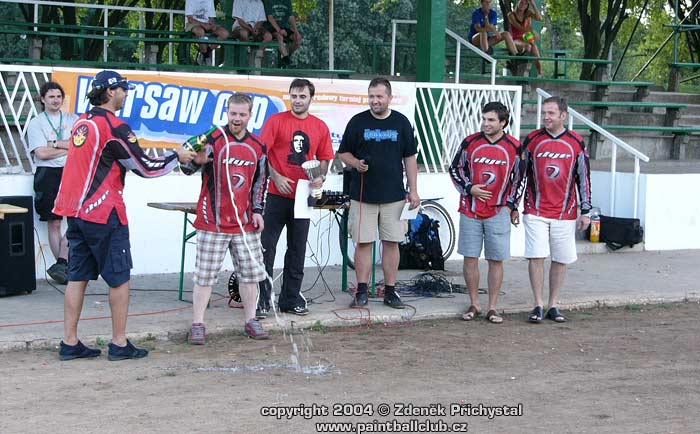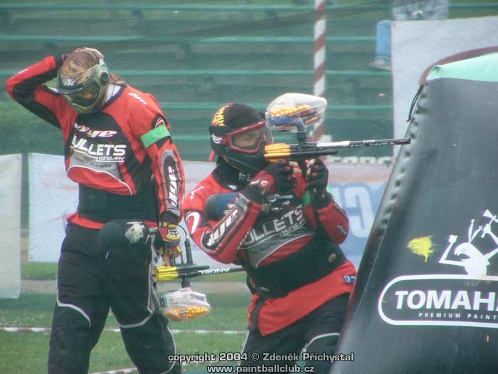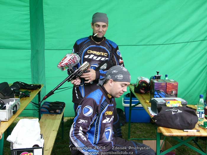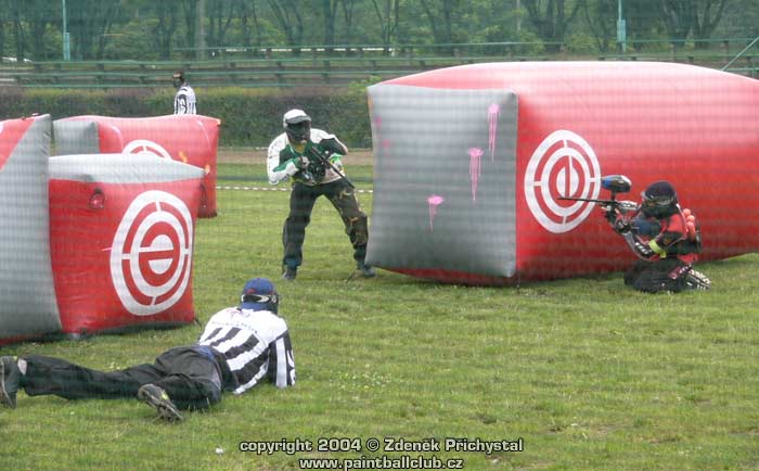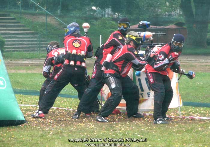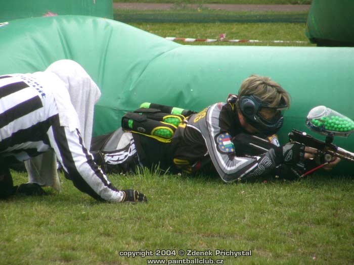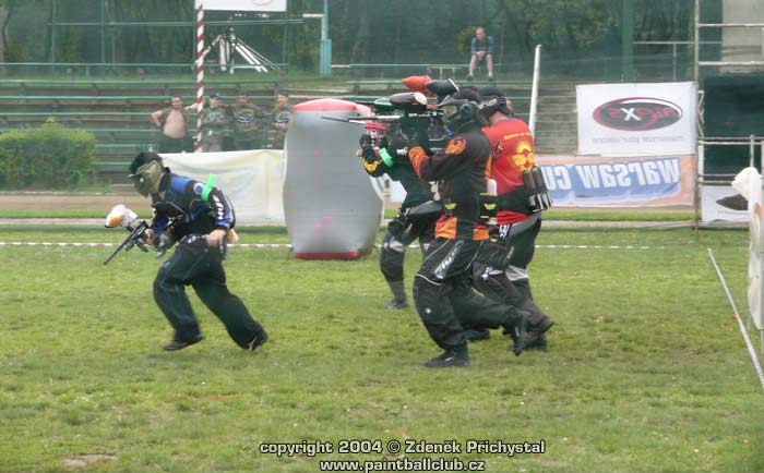Pro hráče bylo připraveno dobré zázemí v podobě stanů, stolů a lavic, tedy bylo kam vyskládat vybavení a kde se posadit a skrýt se před případnou nepřízní počasí. Počasí, to se mě v Polsku také líbilo. Dopoledne zataženo, akorát teplota, žádný pařák, úderem dvanácté vysvitlo slunce a dalo se opalovat. Žádné vedro hned od rána, dopoledne se tedy dá pracovat odpoledne odpočívat. Hřiště byla velmi dobře postavena, umožňovala útočnou i obrannou hru a dávala šanci i slabším týmům. Co se týká jednotlivých týmů a her, o tom zde psát nebudu, to si můžete přečíst na stránkách Mafie kde to Aleš jistě náležitě vysvětlí a popíše. Jenom se musím zmínit o tom že zde byl k vidění opravdu kvalitní paintball, byly zde samozřejmě týmy známé již z pražského kola jako např. Bullets, Che nebo Freefall, osobně velmi obdivuji hru ruských Grad kteří hrají velmi silový paintball, zde si musíme přiznat že hlavně ruský, polský a maďarský sportovní paintball se nám začíná vzdalovat, jsem zvědav jak si s touto silnou konkurencí poradí příští sezónu Mafia která bude pravděpodobně EEPL hrát. Česko reprezentoval pouze jediný tým, pražská Troia v obsazení Vladan, Zdenek, Tomáš, Renda a Hogen, na tomto turnaji poprvé hráli s novými Empire Intimidatory které vynikají rychlostí střelby a vysokou pořizovací cenou. Specialitou prvního herního dne byl X-ball, soupeřili spolu hráči Polska a Ukrajiny. Hry byly velice rychlé a divácky atraktivní, hodně se povzbuzovalo a bylo zábavné vidět jak diváci a nehrající X-ball prožívali a jak moc radili hrajícím což samozřejmě pravidla dovolují. Po skončení prvního herního dne se nám ještě nechtělo odcházet a proto jsme využili posezení u občerstvení a s hráči Troia a částí Devils jsme se usadily a začali konzumovat, alespoň někteří z nás. Byl příjemný večer, k dobru se dávaly zábavné historky kterých má zvláště Hogen bezpočet a proto se nám nechtělo ani odejít. Ale nic netrvá věčně, ani láska k jedné slečně a proto jsme se zvedli a odešli na hotel. Po nezbytné hygieně jsme s Hogenem za volantem vyrazili hledat KFC kterých jsme předchozí den viděli v okolí bezpočet. Samozřejmě jsme nenašli ani jeden a tak po hodině bloudění kdy většina osádky spala spánkem spravedlivých jsme zastavili u Mac Donaldu, kterých je zde bezpočet, zhruba jeden na půl kilometru. Tím chci říci že paintball dnes již není jenom sportem ale i zvláštní a zábavnou společenskou událostí se spoustou zážitků, ovšem někdy pouze pro otrlé.