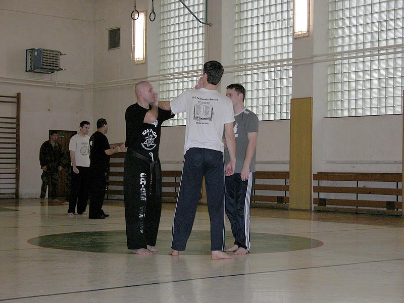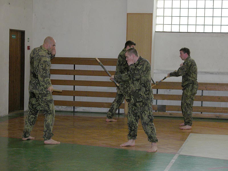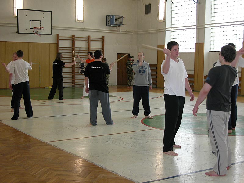 Cvičení bylo rozdělené do dvou bloků. V první části se začalo rozcvičením a strečinkem, následovali základní techniky (kryty, údery, kopy, páky). V druhé části se trénink zaměřil na boj s krátkou holí a především boj proti noži.