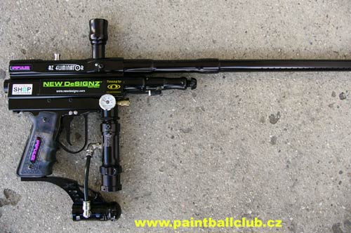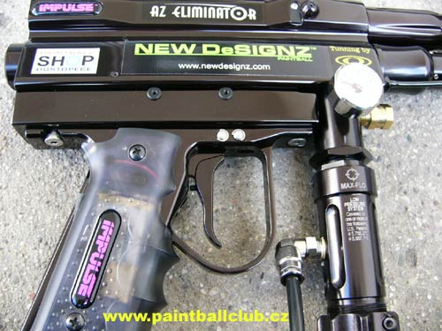 Použit je zde základní Impulse s vertikálním regulátorem který je pro naši potřebu naprosto dostačující.. Elektronické oko zde není nutností protože AZ Eliminátor pracuje s tak nízkým tlakem ( 80 - 100 psi ) že závěr kuličky netrhá, dojít k tomu může pouze je-li opravdu velmi pomalý zásobník který nestačí podávat nebo velmi špatné ( ale levné ) kuličky. Impulse je zbaven všech vnitřních dílů které jsou postupně nahrazovány novými. Venturi bolt je nahrazen samomazným který má menší koeficient tření a má další potřebné vlastnosti. Úbytek hmotnosti způsobený výměnou boltu je dorovnán použitím středně těžkého ocelového kladívka s titanovým vodícím pinem který je navíc opatřen speciálním potahem ke snížení tření. Tlaková komora je vyrobena z odlehčených slitin a jehla je samomazná a velmi malá a lehká, což je potřeba pro dosažení velmi rychlé kadence. Volumizer byl nahrazen LP regulátorem s integrovaným tapewormem a je velmi důležitý pro dosažení co nejnižšího a stabilního provozního tlaku, tolik potřebného pro správnou balistiku a kadenci. Spoušť, další z důležitých prvků pro ultrarychlou kadenci je rovná a dvouprstá, typu Blade a v tomto nastavení se s ní setkáte jenom na AZ Eliminatoru. Při její montáži jsou použity upravené čepy a pružina, mikrospínač je upraven pro rychlejší odezvu a spoušť je tak velmi krátká, jemná a velmi rychle a plynule reaguje. Střenky byly nahrazeny pohodlnějšími gelovými které pomáhají při stabilnějším úchopu. Hlaveň je DYE Ultralite která je známá svou snášenlivostí a přesností a pomáhá tak Eliminátor dotvářet. Na výběr je z délek 12, 14, 16 a 18“ o průměru 688 a dále je v příslušenství standardní 12“ 691 SP Progressive. Asa adapter je doplněn o Xsystem on/off drop forward který dovolí použití vzduchové láhve bez nutnosti jejího sundávání po hře a činí Eliminátor s lahví velmi kompaktní, což je pro hru na překážkovém hřišti velmi důležité.