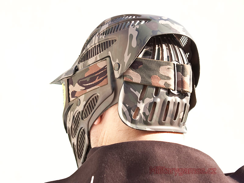 Pod bradou je maska vybavena měkkou páskou, délkově stavitelnou, která přidržuje masku tam, kam patří a nemůže se nám tedy stát, že při běhu podrostem nám maska zachycená větví spadně ve chvíli, kdy do našeho obličeje míří dávka z protivníkovi zbraně. Nad brýlemi je opatřena sundávacím slunečním štítkem - kšiltem, který odstíní přímý sluneční svit, který by nás oslepoval, ochrání sklo před děštěm a eliminuje svým stínem odlesky lexanu.
