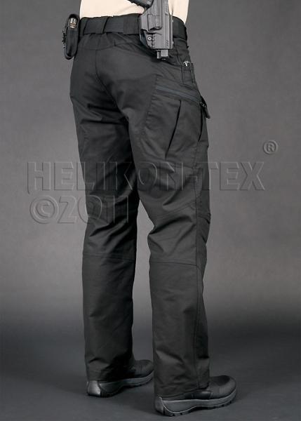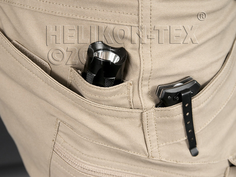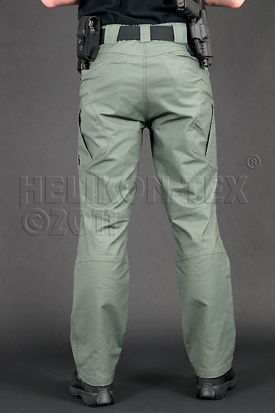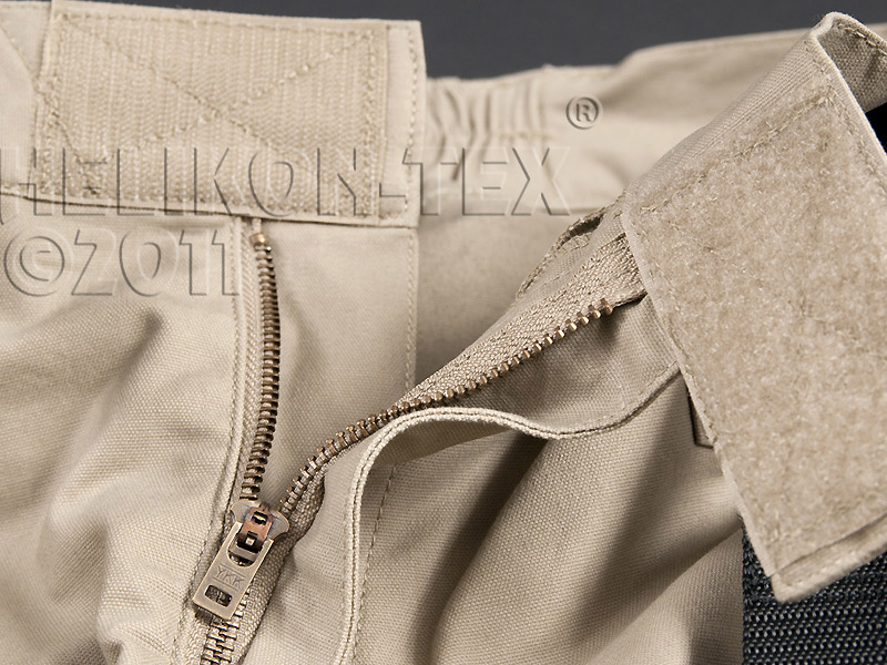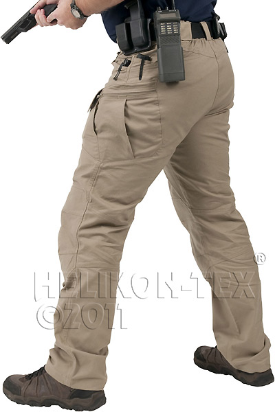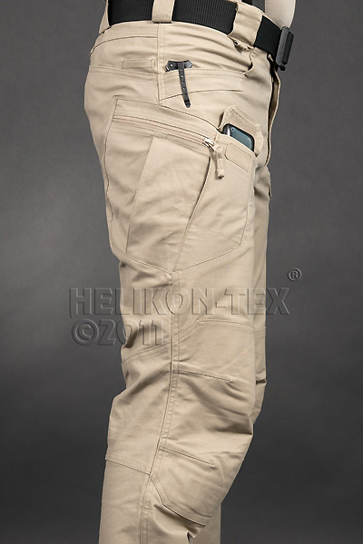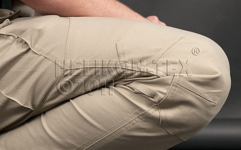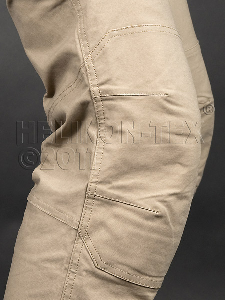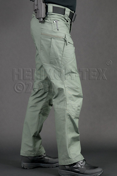 Jedná se o bavlněné kalhoty s příměsí elastanu. Bavlna má dobrou pevnost v tahu (245–373 mN/tex) a v oděru, která se za mokra dokonce asi o 20 % zvyšuje. Proto se používá s výhodou zejména na výrobky, které jsou v tomto směru namáhány a musí se často prát. Elastan Spandex zajistí dobrou roztažnost látky a kalhoty jsou tak velmi pohodlné i při zvýšené pohybové aktivitě. Střih je praktický, v zadní části pasu je široká guma, díky čemu kalhoty velmi dobře drží v pase i při pohybu a jsou stále pohodlné, zapínání je na suchý zip, což umožní rychlé rozepnutí jednou rukou, je-li to potřeba. Dvě zadní kapsy jsou bez patky, se zapínáním na suchý zip, což opět zajistí rychlý přístup a pohodlí. Přední kapsy jsou sešikmené, vrchní opět bez patky, stehenní se zavíráním na zip a dělené, s kapsičkami např. na zásobníky nebo mobil. Kolena jsou dvojitá a pevná, anatomicky tvarovaná. Všechny švy jsou pevné, většina dvojitá.
