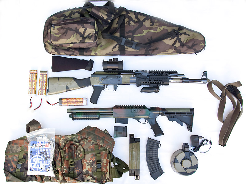 Tokio Marui AK 47 s pružinou 120, díly Powerupgrade, kovovým taktickým předpažbím, taktickou sklápěcí ručkou, třemi zásobníky, třemi značkovými bateriemi, neoprenovým potahem na pažbu, tříbodovým poruhem, přepravní taškou vz.95, kolimátorem PBS. K tomu brokovnice se dvěma zásobníky, chest rigg flecktarn. Vše samozřejmě ve výborném stavu a plně funkční, pravidelně 2x ročně servisováno v Actionshopu Brno u Taylora. Cena 8 000; Kč. viz foto č.2. Více info na info@ militarygames.cz