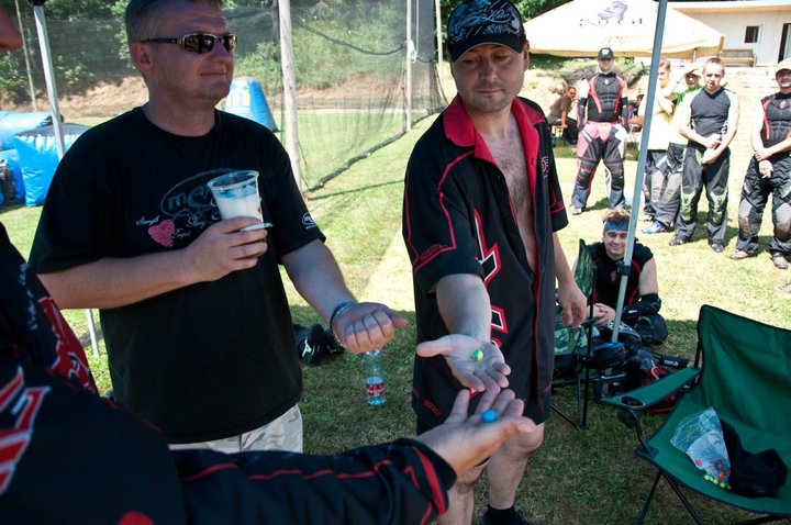 Hry 10 na 10 jsou pěkný kotel, když vám začne najednou pálit 20 lidí při kadenci 10 bps, tak je to pastva i pro uši.:-))) To už jsme se dostali k podvečeru a Tom Twin vytáhl další trumf z rukávu, kdy přistavil helium a začal plnit balonky, které pak připevnil na hlavně. Cílem bylo sestřelit protivníkův balónek. Na hřišti bylo asi 6 hráčů a hrál se death match, takže to byla mela. Hlavně pro ty, kteří už odložili chrániče v domění, že se buse pálit jen na vznášející se balónky. Ovšem kulky sekali nejen balónky, ale hlavně hráče. Jako nejlepší sestřelovač se ukázal Toulis, který rosekal Tommyho Novotného ve vzájemném souboji i s balonkem Nbo pokud si vzpominám nějak si Tommy ten balónek ustřelil sám.:-).