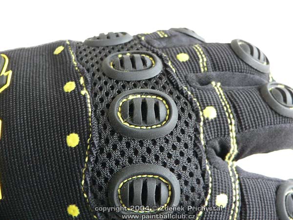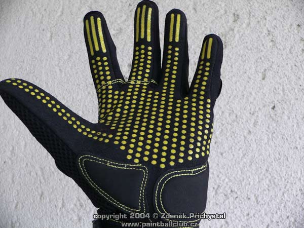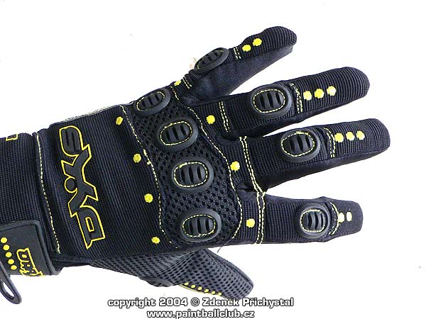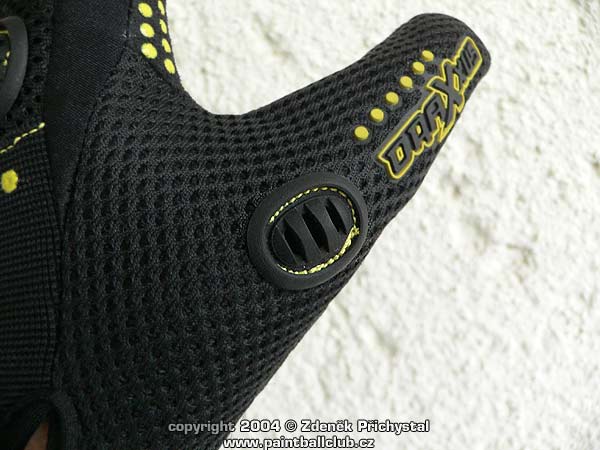 Všechny tyto požadavky splňují i sportovní rukavice DraXxus, dodávané v mnoha barvách. Jsou pohodlné, kvalitní, dobře se nosí a dobře vypadají. Na choulostivých místech jako jsou třeba klouby rukou a prstů jsou chráněny gumovými lamelami které velmi dobře chrání před nárazem a svojí pohyblivostí navíc znesnadňují rozbití kuličky. V zápěstní části jsou zpevněny páskem na suchý zip, dlaně mají na potřebných místech dobře vyztuženy. Samozřejmostí je příprava zapošitím na odstřihnutí prstů a to jak na pravé tak i na levé ruce. Velmi dobrou vlastností je i nástřik gumových bodů na dlaních a prstech, nyní se již tedy nemusíme bát že nám bude pažbička zbraně v rukavici znečištěné barvou z kuliček neustále klouzat a my nic netrefíme, toto vtipné řešení nám zbraň pevně fixuje tam, kde má být. Celkově se tedy jedná o velmi kvalitní a účelné rukavice jejichž jedinou chybou je jen poněkud vyšší cena, která ovšem za to stojí.