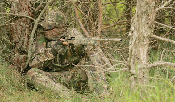 A teď dosti poučování a historie a podívejme se, co z toho pro nás plyne. Je nám už jasné, že potřebujeme vzor s dostatečným kontrastem mezi jednotlivými poli, neboť jinak od určitých vzáleností dochází k jejich splývání a jejich krycí účinost se zmenšuje (neplatí vždy, ale většinou). Vzory musí mít schopnost vizuálně rozbít plochu na které se nacházejí a snížit tak možnost její identifikace, barvy musí být pokud možno nekontrastní k okolnímu většinovému prostředí v danou roční dobu. Toto nabízí většina z dostupných maskovacích vzorů, proto konečný výběr záleží jen na vás:) Tak jednoduché to samozřejmě není, já osobně dávám přednost tomu co se mi líbí před dokonalými krycími schopnostmi (existují-li vůbec takové) a protože se mi líbí skoro všechny, tak si radši koupím desatery různé maskáče od Mil-tecu, nežli za stejnou cenu jedny "originální" které bych se bál i ušpinit a musel je nosit všude, tedy i tam, kde by byly nevhodné, ale když byly tak drahé že na jiné už nemám... Důležitý je i jejich tvar, moderní upnuté střihy jsou sice na svalnaté postavě nositele impozantní a líbivé, ale pytlovité převlečníky lépe rozbijí siluetu a jsou i pohodlnější. Také nevidím důvod k nutnému použití kompletu, máme -li rozdílné maskování vrchní a spodní částí beru to jako plus, neboť i v terénu je rozdíl v barvách u země, kde většinou převládá knědá a mezi vyšší částí v úrovni hlavy, kde většinou převládá zelená. (všimněte si prosím, že píši "většinou") Pro větší názornost tedy popíši svůj běžný ohoz: kalhoty erbsenmuster, vrch eichenlaubmuster převlečník, pohodlný a praktický. A ať už se vám to líbí nebo ne, mě ano a jsem spokojen:) Neméně důležité je i maskování hlavy, jako nejpraktičtější řešení beru klobouk, velmi dobře změní siluetu hlavy a ramen a navíc stíní krk a uši před sluncem. Výborné jsou i maskovací šály - známé i jako barakudy nebo sniper šály. Navíc nosíme-li paintballovou masku, barakuda přehozená přes kšilt a visící před sklem brýlí nám výborně zastíní a ukryje velkou lesklou plochu brýlí a prakticky nezhorší výhled, když tak jen minimálně, což oceníme zejména v "číhacích" pozicích.