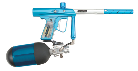Dalším zajímavým prvkem je násypka, která je velmi nízká a tím pádem se lze domnívat že při vysoké kadenci zde bude docházet k problémům s podáváním kuliček. Spoušť je typu Blade, tedy rovná dvouprstá a vypadá velice dobře. Přední rukojeť viditelně neobsahuje žádný regulátor, bude tedy sloužit pouze pro zlepšení úchopu. Pod zbraní se nachází integrovaný vzduchový systém se zřetelně inovovaným Max Flow regulátorem a domnívám se že minimálmě ve verzi 4 500 PSI.