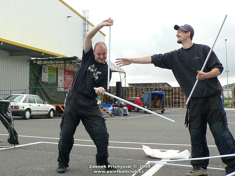Tak jak to tedy v Olomouci bylo a co se tam dělo? V první řadě musím říci že mě velmi překvapil a potěšil prostor který domácí pořadatelé zvolili. Rozlehlá asfaltová plocha s velkým stanem pivovaru Litovel, pódiem pro hudební skupiny a plochou pro paintball ( ta plocha musela být opravdu na asfaltu a to vzhledem k možnostem pohybu vozíčkářů pro které byla určena první část herního dne ) a sdostatkem prostoru pro diváky neměla chybu. Pro X-ball bylo dokonce připraveno travnaté hřiště, které jsme ovšem nevyužili a X-ball odehráli na onom asfaltovém a to k plné spokojenosti hráčů. Nebudu vás zde unavovat rozsáhlým popisem celého dne, to si jistě rádi přečtete na stránkách domácích pořadatelů a proto další poznatky bodovitě a stručně. Atmosféra byla vynikající, Litovelské pivo studené a dobré, navíc čepované sličnými slečnami po kterých Beri neustále toužebně pokukoval, k jídlu steaky a klobásy, na pódiu na živo kapely s rockovou muzikou, exhibice kadeřníka, zásah hasičů, množství diváků, dobré počasí s jedinou přeháňkou a mnoho a mnoho dalšího.