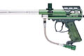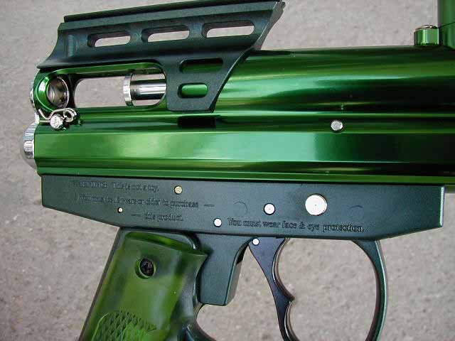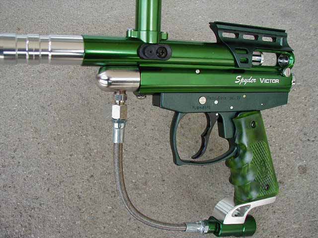 Victor. Jak ho již jméno předurčuje, stal se tento nástupce Sonixu mezi hráči velmi populární a to zejména pro svoji příznivou cenu a vysokou užitnou hodnotu.. Elegantní hliníkové tělo, jehož přední části dominuje mohutný stříbrný volumizer který je nezbytností pro optimální podávání plynu při rychlé střelbě přechází do zadní části která je odlehčena velkým výřezem, v němž vidíme pracovat venturi bolt. Toto řešení je výhodné pro rychlou kontrolu natažení zbraně a tím že nám bolt nevyjíždí dozadu za zbraň můžeme střílet ve velice kompaktním postoji a tím zmenšit cíl pro protivníka. Nechybí zde tradiční lyžiny pro montáž optiky, dnes tedy spíše oblíbeného kolimátoru, který je pro kontaktní boj vhodnější. Mechanika je uvnitř těla zbraně jištěna pinem se závlačkou, inovovaná boční blokace nedovolí nabít více jak jednu kuličku. Rychlost seřídíme klasickým šroubem pomocí přiloženého klíče. Díky centerfeedu je Victor s plným VL 200 a 12oz lahví dobře vyvážený a šikmý bottom line umožní velmi dobrý posaz při mířené střelbě, s kolimátorem a hlavní SP byla přesnost Victoru překvapující a tento se mohl směle měřit i s dražšími zbraněmi. Zde se plně potvrzuje že i levnější zbraně jsou při vhodném upgrade schopny podat solidní výkon. Spoušť je dvouprstá, celkem rychlá, s dlouhým tahem, pažbičku kryjí poloprůhledné střenky v barvě zbraně, které umožní pohodlný a jistý úchop a zabrání klouzání dlaně.. Nádech luxusu dodá kvalitní modrý nebo zelený metalický lak v kombinaci se stříbrnými díly. Přesnost a dostřel je ovlivněna dodávanou hlavní a je srovnatelná s každou zbraní této kategorie. Výhodou je bohatá nabídka hlavní a příslušenství pro Spyder, díky kterým můžeme svoji zbraň výrazně vylepšit. Nevýhodou je nepříliš dobrá hlaveň, tu si Victor jistě zaslouží lepší a plastový rám pažbičky, což je ovšem daň za velmi nízkou cenu. Obojí jde samozřejmě rychle a spolehlivě napravit, v Paintballshopu Hustopeče na počkání. Jsme li navíc manuálně zruční, můžeme si za zanedbatelný peníz Victor vylepšit o se týče podávání plynu a velikosti kopu..V této kategorii se tedy díky kvalitě jedná o těžkou váhu a Victor si určitě naši pozornost zaslouží, alespoň pro první seznámení s paintballem. ZP 2003
