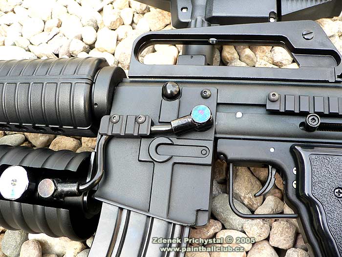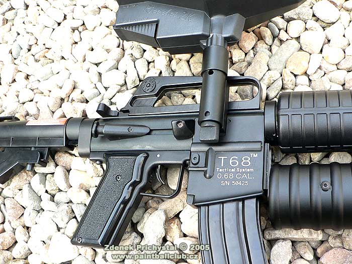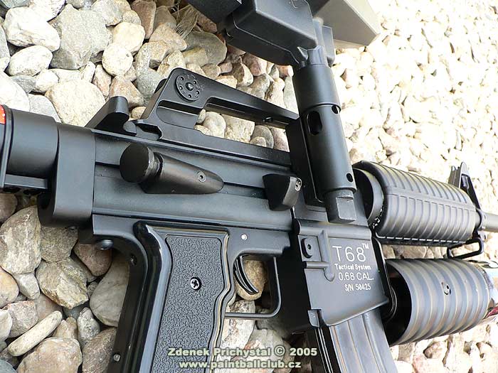 Před nedávnem jsme recenzovali paintballové zbraně reálného vzhledu od firmy Armotech a nyní zde opět máme podobný výrobek ovšem od jiného výrobce, což je asi také zřejmě nejpodstatnější rozdíl který je rozlišuje. T 68 je podobné konstrukce a my si povíme od rozdílech a odlišnostech tohoto modelu. Nejzajímavějším a zřejmě i nejdůležitějším bude kolínko pro zásobník, které je zde umístněno na levém boku zbraně. Tento systém známe např. z oblíbeného modelu GT 1 a jeho výhodou je snadnost čištění v případě rozbití kuličky boltem, lépe drží kuličku a znemožní ji odskok nahoru např. při běhu nebo naklonění zbraně a hlavně nezavazí v průhledu. Dále je zde vtipně řešeno uložení láhve s CO2 pod hlavní, láhev se umístní do plastového ochranného krytu a nám tedy při rychlé střelbě neomrznou prsty, navíc to dobře vypadá, skoro jako granátomet. Pažba je stavitelná a je vybavena úchytem pro nosný popruh který je nezbytností, neboť po několikahodinovém nošení budeme mít pocit že nám díky váze zbraně ruky ochrnuly. Inu, realita je realita. Systém zbraně je totožný s ostatními zbraněmi této kategorie a je tedy dostatečně spolehlivý a odolný. Údržba a tedy i sborka a rozborka zbraně jsou jednoduché a zvládne je i začátečník. Na výběr je široká škála doplňků jako třeba kolimátor, baterka, optika a tlumič výstřelu, dále je možnost umístnění láhve s CO2 pod pažbičkou nebo na zádech. U námi testovaného modelu byla k dispozici elektro-pneumatická spoušť která umožnila střelbu jak jednotlivými ranami, tak i dávkou. Hlaveň je opatřena děrováním a je dostatečně přesná.
