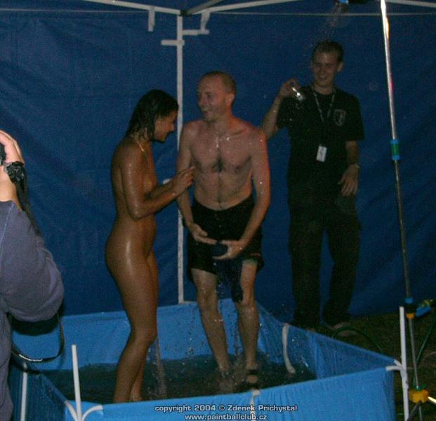 První den tedy probíhal poklidně(alespoň pro mě ) hráči hráli, rozhodčí rozhodovali a diváci se dívali. Jelikož jsem pro časové zaneprázdnění a velmi pokročilou artrózu již v herním důchodu nebudu zde hodnotit kvalitu a průběh her, to přenechám povolanějším a můžete si o tom přečíst na stránkách Mafie ale zaměřím se na podstatnější věci nežli plýtvání kuliček na hřišti. Tím se tedy dostáváme k tomu podstatnému, k večerní párty. Možná budete překvapeni když vám prozradím že se konala večer, možná ne. Každopádně byla velmi fikaně konána přímo na hřišti což je velmi rozumné a člověk se nemusí nikam po hře trmácet a pak zase zpátky a následně s již otupeným orientačním smyslem opět zpět ( v lepším případě ) Čekání na tmu? a začátek párty mělo nedočkavým zkrátit promítání videa z předešlého ZCES 03 a při tomto mě potěšila dnes již polozapomenutá historka kterou vám musím říci. Na loňské párty v klubu Face to Face jsme pro Beriho který zrovna slavil 16. narozeniny domluvili malý dárek v podobě jeho účasti v následné miss mokré tričko. Tedy ne že by soutěžil i on ale účinkující ( mimochodem velmi dobře vybavené! ) měli Beriho vytáhnout z davu a zakomponovat ho do svého vystoupení. Což se také stalo a Beri byl velmi potěšen. Co je ale pointa celého příběhu je že si myslel že je ze všech přítomných ten nej a proto je vybírán pouze on. Bohužel celá věc mu byla poté vyzrazena a Beri se tak poprvé setkal se ztrátou ideálů. Inu život bývá někdy krutý a nemilosrdný. Nejočekávanějším bodem letošní párty tedy byla opět ona miss mokré tričko což bylo vidět i na Vladanovi který po shlédnutí účinkujících zaujal jen ve slipech strategické místo v zákulisí aby nemohl být při výběru dobrovolníků předběhnut, o čemž se můžete přesvědčit na fotografii kde tahá jednu z účinkujících do bazénu a přítomní ví že ani Hogenovi se ho nepodařilo vytáhnout. Mládí bývá někdy nedočkavé a proto mu to odpusťme. Dále zde byl praktikován bodypainting který podle další usvědčující fotografie využil Beri k pozdní večeři. Zajímavé bylo i vystoupení skupiny praktikující Kung-fu která předvedla ukázky bojových umění. Vrcholem bylo vystoupení dvojice s ohnivou show která dokázala vytvářet velmi zajímavé světelné obrazce. Po jejím skončení a uhašení neopatrného diváka který po celý den popíjel a poté se neopatrně přiblížil k vystupujícím následovala volná zábava podbarvená hudbou.